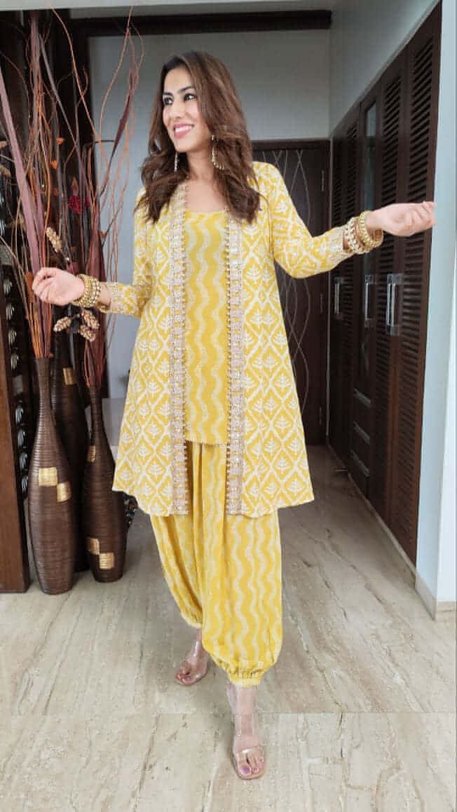 Elevate your wardrobe with this sophisticated yellow three-piece coord set. Featuring a chic open jacket with gold border detailing and three-quarter sleeves, paired with a sleeveless top showcasing wavy stripes and delicate gold lace around the round neckline, this ensemble exudes elegance. Completing the set, the pathani-style elasticated pants add comfort with a unique hemline for a relaxed yet stylish look.